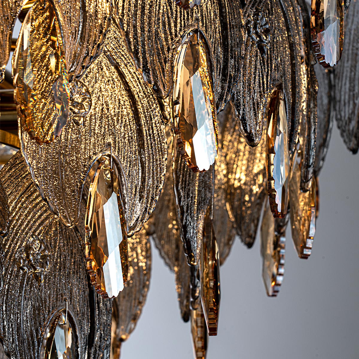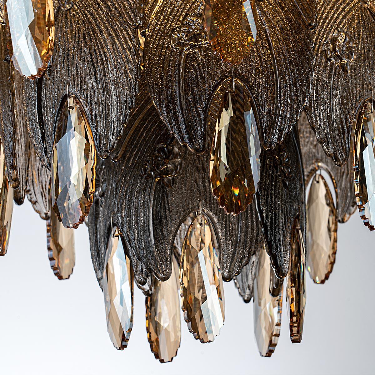 Коллекция MODELUX ML.6928 – пример удачного сочетания характерных для стиля модерн природных мотивов, элегантных форм классики и помпезной роскоши арт-деко. Подобно великолепным перьям павлина украшают основание декоративные элементы из хрусталя с крупным янтарным кристаллом. Их великолепное соцветие придаёт композиции утончённый готический вид, это симфония света, подобная застывшей музыке органа. Серия представлена подвесными люстрами и светильниками в прозрачном и дымчатом вариантах цвета.